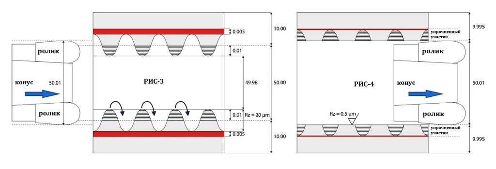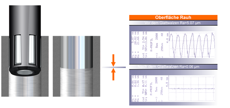 The surfaces can be burnished to roughness values below Rz 1μm with high bearing ratio up to tp = 95 % by one pass (see chapter 4). The tool can process all workpieces with the same adjustment interior H7 tolerance after adjusting it to the size you